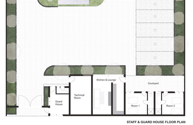 A luxury single storey contemporary design with angular outlines embodying timeless fluted cladding, with details such as skylights and floor to soffit glass doors creating a sense of openness bringing in natural light and a connection to the outside. Catering for 4 bedrooms, a home office, gym, private guest suite, guardhouse & staff quarters.